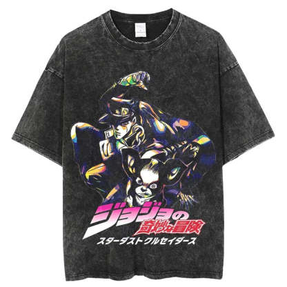 JoJo's Bizarre Adventure Ripple Energy Vintage T-Shirt. Premium 100% cotton tee featuring a bold, vintage-inspired Jojo's Bizarre Adventure graphic. Oversized fit for a relaxed, streetwear look. Soft, breathable fabric. Ribbed crew neck. Double-stitched sleeves and hem. Sizes S-3XL. Machine wash cold, inside out. Perfect forJojo's Bizarre Adventure fans and casual anime style. Durable print stays vibrant. Ideal for everyday wear or cosplay events.