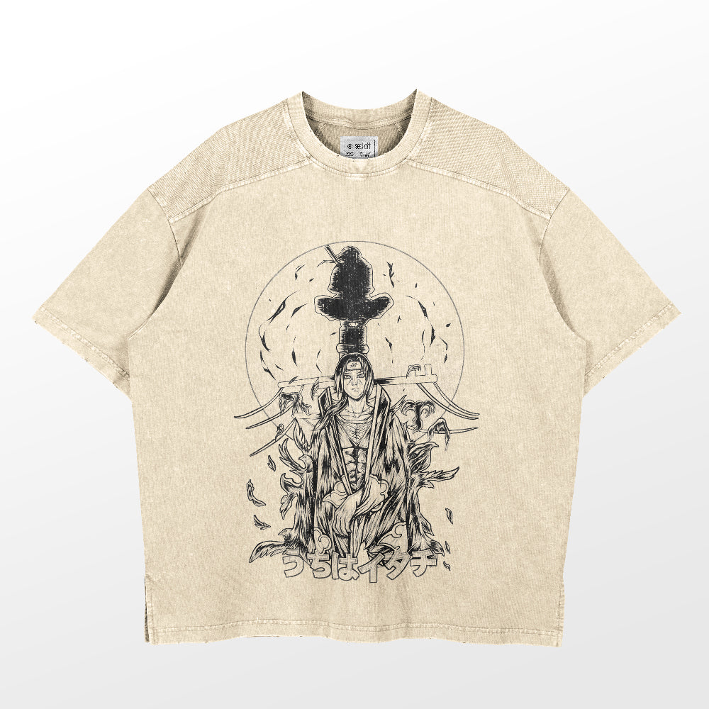 Honor the legacy of Itachi Uchiha with this washed vintage T-shirt, featuring the enigmatic member of the Akatsuki from the Naruto series. Crafted from premium 260 GSM cotton, this T-shirt offers both a soft feel and lasting durability, perfect for everyday wear. The high-definition print captures Itachi's solemn and powerful presence, surrounded by symbolic imagery and his Akatsuki cloak, making it a tribute to one of the most iconic characters in anime history. Its unique stone-washed effect and relaxed drop-shoulder fit bring a blend of anime aesthetics with a streetwear vibe, ideal for any Naruto fan.