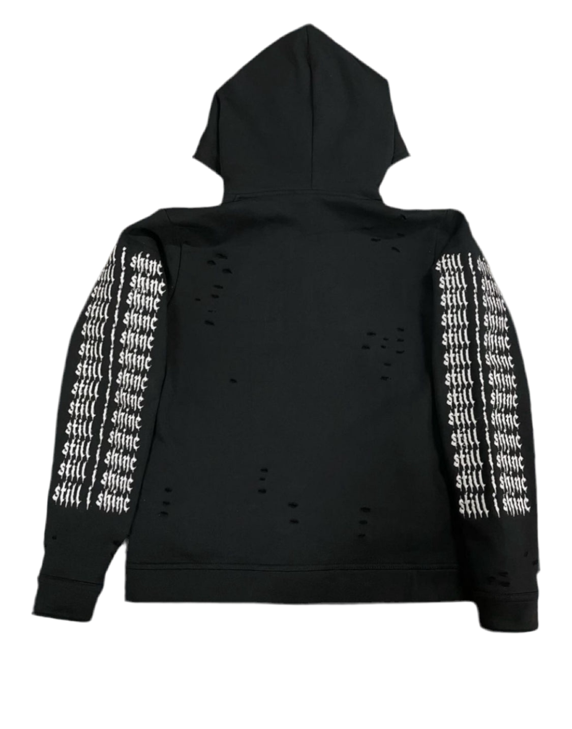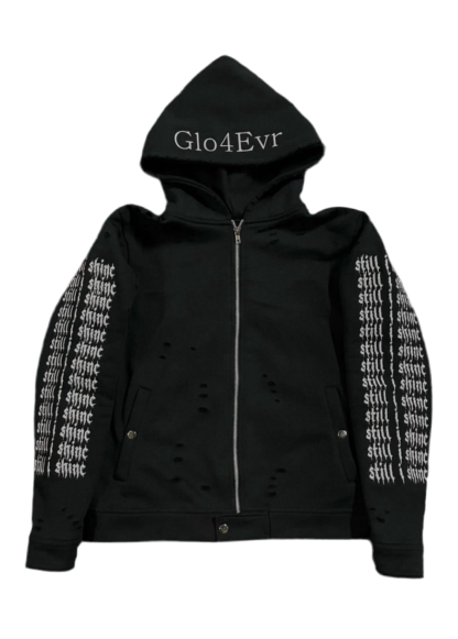 "Still I Shine" sleeve graphicDistressed hoodie design"Glo4Evr" embroideryFull zip frontFREE SHIPPING
